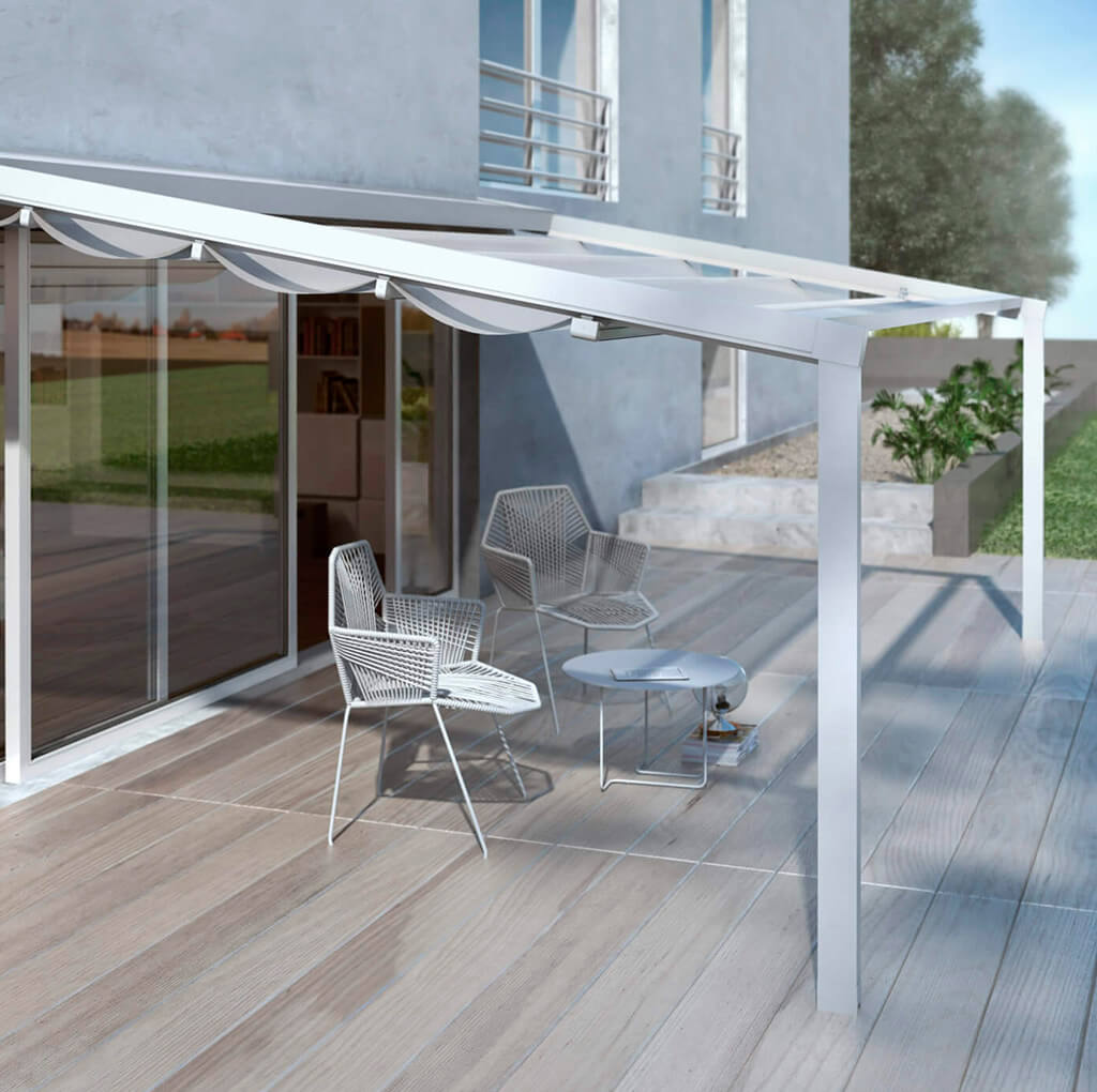 Pérgola retractil de aluminio con toldo que se puede empaquetar, hecho por un tejido (tendido cuando abierto) fijado a un sistema de perfiles transversales, carritos y guías que permiten el movimiento horizontal.