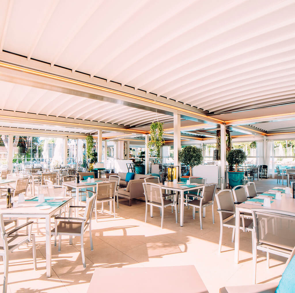 La fortaleza del aluminio y la potencia de los motores que mueven los paneles de la pérgola bioclimática retráctil se sumergen en un diseño minimalista y muy elegante.